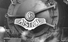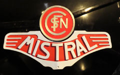 Schnelle Fahrzeuge nach kräftigen Winden zu benennen, war wohl kein Einfall eines Autoherstellers, sondern eher der SNCF. Bis 1981 war der „Mistral“ der europaweit schnellste fahrplanmäßige Zug. Die „141 R“, im Modell neu aus der Lokfabrik Märklin, war anfangs die reguläre Zuglok; 1961 wurde sie nach Elektrifizierung der Strecke von der BB 9200 ersetzt. Die „Mistral-Dampfer“ - auch die in Mulhouse ausgestellte 241 P- trugen ein äußerst markantes Schild an der Rauchkammertür, das für HO-Maschinen aus Neusilber geätzt wird. Um am edlen Modell nicht mit Sekundenkleber zu arbeiten, ermöglicht die Größe bzw. Breite des Schildes ein Ankleben mit einem Stück Doppeltesa. Es ist aber auch für Elloks verwendbar; die BB 9200 sowie CC 7100 und CC 6500 waren auf der Relation Paris – Marseille – Nizza auch damit ausgestattet.