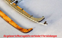 Für die „Lollo“ aus dem Hause Lenz wurden aus nur 0,2 mm starkem Blech feine Lüftergitter in vorbildgetreuer Maschenweite geätzt, in der Vorserie als zwei einzelne Teile, die mit verdünntem Holzleim eingeklebt werden. Zwischenzeitlich wurde die Konstruktion zum „Tandem“ überarbeitet, sodaß der Einbau wesentlich erleichtert wird, und auch kein Ausrichtungsfehler (längs oder quer) mehr auftreten kann.