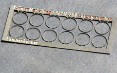 Der Durchmesser der neuen Teile entspricht exakt den Lampenkörpern am Lenz-Modell. Zur leichteren Positionierung zentrieren sie sich, wenn man vorsichtig die INNENkanten der Lampenkörper mit einem Kugelfräser, der mit den Fingern und nichts anderem bewegt wird, minimal abschrägt. Dadurch entsteht auch eine größere Klebefläche. Wer noch mehr Plastizität möchte, kann einen zweiten Teilesatz (2. Obere Ebene) bekommen, bei dem die Außenkanten der Ätzteile leicht abgeätzt sind, um die Ausrundung wie beim großen Vorbild annähernd zu erreichen. Der sinnvollste Weg ist, Ebene 2 auf Ebene 1 zu legen, punktuell zu verlöten oder zu verkleben, sodann lackieren, aus dem Rahmen trennen und am Gehäuse anzukleben: mit einem Pinselstrich verdünnten Holzleims oder Klarlack.