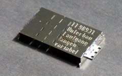 Um das Kleben kommt man nicht herum: die optisch beste Lösung sind daher dem Vorbild angenäherte Halterungen, durch die vorlackierte Messingdrähte geschoben werden können. Die Halterung bietet genug Klebefläche und ist auf Wunsch bereits im gleichen Farbton lackiert wie die Rückseiten der Schilder. Der Teilesatz enthält 42 Halterungen in drei verschiedenen Längen, sodaß für jedes aufzustellende Schild etwas Passendes dabei ist.