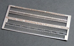 Weniger ist mehr, heißt es aus gutem Grund. Auch bei einer Bahnschranke. Der Behang besteht im Original aus Draht mit 5mm Durchmesser; das wären in HO 0,04mm Durchmesser. Bei einer Gesamtlänge von 8 Metern und einem Abstand von 10 cm dürften Sie 160 Drahtstücke ablängen - und im richtigen Abstand natürlich - zwei Ösen hineinbiegen. Wenn man nun auf das eigentlich wünschenswerte Merkmal der Beweglichkeit verzichtet, könnte man sich die Strafarbeit ersparen - und den gesamten Behang durch ein einziges Ätzteil ersetzen. Angesichts der Tatsache, dass die allermeisten Modell-Bahnstrecken so vielbefahren sind, dass ohnehin kein Auto hinüberfahren kann, eine sehr praktische Lösung.