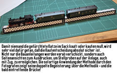 Kompletter Gleis-Selbstbau wäre nur dann noch erforderlich, wenn man breitere Brückenbalken (Schwellen) haben möchte: sie sind, wie die Bilder zeigen, in der Tat breiter als gewöhnliche Schwellen.