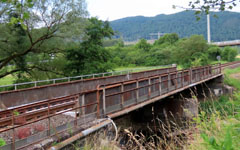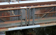 Die genietete Konstruktion stammt wohl aus der Zeit der Streckeneröffnung um 1883, erreicht also mindestens die dreifache Lebensdauer einer modernen Spannbetonbrücke.