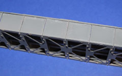 Dieses Brückenmodell, dessen Vorbild bei Mariaort, unweit von Regensburg, die Donau überbrückt, war der Anfang einer inzwischen beachtlich langen Liste von Modellbrücken (von Spur Z bis Spur 1). Konstruktionsbedingt mußte sie gelötet werden - was zu "natürlichen" Verwindungen führte. Ein Lehrbeispiel, wie man es besser (nicht) macht. Bei ausreichendem Interesse besteht die Chance auf eine Neuauflage: eine nahezu lötfreie Leichtbaukonstruktion, fein detailliert, mit optimierten (vorbildnahen) Abmessungen. Die maßstäblich richtige Länge eines Segments wäre 31,6 cm, das abgebildete Modell-Segment ist 21 cm lang.
