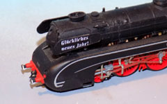 Es war ein netter Zug der Bundesbahn, hin und wieder Botschaften und Wünsche auf die Windleitbleche von einigen ihrer Lokomotiven zu malen: so auch „Glückliches neues Jahr“. Das tamponbedruckte Schiebebild sollte unbedingt mit Hilfe von Weichmachern aufgetragen werden. Und wer nicht dauerhaft damit herumfahren möchte, legt sich eine weitere Garnitur Windleitbleche zum jahreszeitangepaßten Austausch bereit.