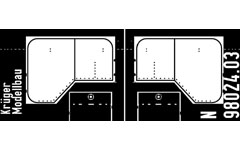 Eine exakte Nachbildung eines Schneepfluges für die BR 52 ist entstanden, wie er noch heute an einigen Museumsloks zu finden ist. Das winklig und maßlich exakte Ätzteil kann unter der Pufferbohle angeklebt werden. Der Pflug an der 52 3865-6 Im Eisenbahnmuseum Nördlingen hat einen auffälligen Warnanstrich, den diese Lok in den 80iger Jahren tatsächlich hatte. Das Aufbringen eines gleichmäßig breiten Warnstreifens, der den Außenkonturen folgt, wird aber zu einem großen Problem werden. Die sinnvollste Lösung ist ein separates Blech (98052.05), das mittels Schablone zweifarbig lackierbar ist.